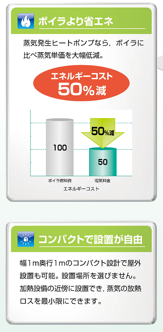 工場で排出される未利用の温水から熱を回収し、飽和蒸気を発生させます。工場の様々な蒸気加熱プロセスに適用できランニングコスト削減につながります。当社の自動販売機で培ったヒートポンプ技術を活用しています。